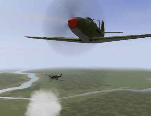 В практике воздушного боя Второй Мировой войны сложились определенные комбинации маневров, которые наиболее эффективно позволяли оторваться от противника, запутать его и подобное. Каждая из противоборствующих сторон рекомендовала свои, но и противник брал их на вооружение. Одна из распостраненных и эффективных комбинаций рассмотрена ниже. Название можете придумать сами, например, что-нибудь экзотическое –«дракон выходит из пещеры…».  Смысл комбинации стандартный – это сложный разворот на 180  градусов без существенной потери скорости и высоты, с уходом от визуального контакта. Можно при выполнении  резкостью или плавностью свободно добиться произвольного курса выхода. Используются такие маневры как горка, скольжение, полубочка, сплит. Скорость для начала выполнения маневра желательно иметь не ниже 320 км/час. Описание всего маневра разбито для удобства на этапы. Этап 1. Позиция – противник преследует с шести часов (висит на хвосте) на  критической дистанции. Начинаем выполнение горки со скольжением вправо, горизонтальную ось движения самолета направить на 50-60 градусов от горизонта (можно начать выполнение маневра и с левым скольжением, тогда все следует выполнять в зеркальном отображении настоящему описанию). Время выполнения горки не более 2-3 секунд!!!! Снижение скорости не должно быть сильно ощутимым, до 270 км/час – это максимум. В эти секунды атакующий еще больше сблизиться с вами и может (скорее всего откроет) открыть огонь. Этап 2.Продолжая скольжение (без какого-либо выравнивания самолета) начинаем делать полубочку (благодаря ей, противник скорее всего промахнется) с вращением плоскости самолета по часовой стрелке (бочка будет размазанная, и попасть в вас будет трудновато). Поворот вокруг оси должен быть немногим чуть больше 180 градусов. В конце полубочки возвращаем педали рудера в нейтральное положение и одновременно берем рукоятку джойстика на себя. Самолет  начинает движение вниз (как при Сплите),  одновременно начинаем скольжение влево. Продолжительность движения в этапе опять-таки не должна превышать 2-3 секунд. Этап 3. В выходе из сплита начинаем делать еще одну полубочку (она получается размазанная) с вращением плоскости самолета по часовой стрелке  Педаль рудера остается зафиксированной влево по время всего этапа. Этап.4 Полубочка завершена. Из положения кокпитом вниз верните педали рудера в нейтральное положение и выполните сплит. Маневр завершен. Управление газом можно охарактеризовать ко всем этапам следующее. Желательно держать газ полным на всех этапах без исключения, но для резкости маневра и при тенденциях к сваливанию в штопор, газ несомненно необходимо сбрасывать. По всем «экспериментам» на сваливание достаточно сброса до 70 % мощности. Все этапы маневра делайте непрерывно, одним движением, по возможности резкость полубочки увеличивайте.