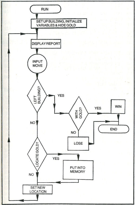 The building layout is included in the array. A(1) to A(100) are set to 0,2,3, or 4. Obviously each array position stands for a room. If a given array position is equal to 2, that's the room holding the gold. This can be any room from #2 to #100 (step 145). Room #1 is the room the game starts in, but it would be a very short game if the gold was found there.