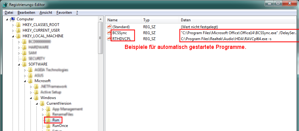 HKEY_CURRENT_USER\ Software\ Microsoft\ Windows\ CurrentVersion\Run (siehe Bild unten)
